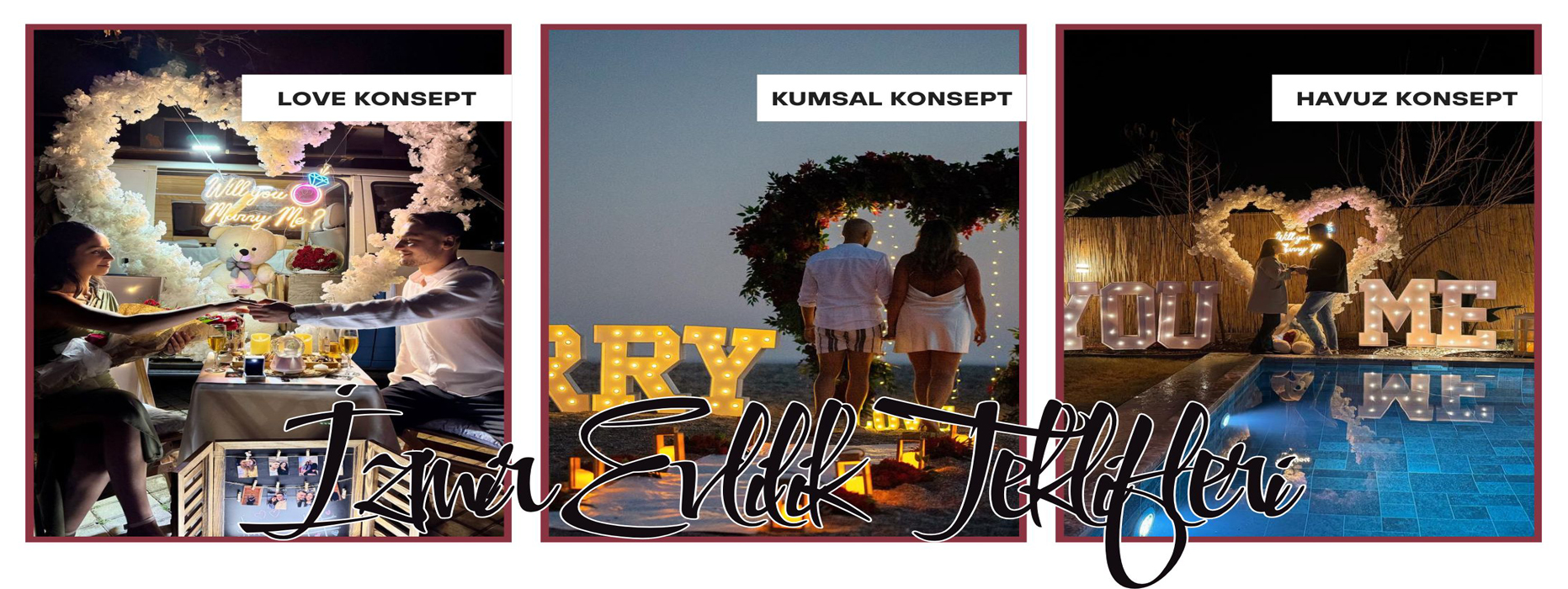 Eşsiz bir deneyim sunmak için trendleri yakından takip ediyor ve yenilikçi fikirlerimizi en güzel şekilde hayata geçiriyoruz. Size en uygun mekanı seçmekten, romantik bir atmosfer yaratmaya, müzik, aydınlatma ve dekorasyon gibi unsurları bir araya getirmeye kadar her aşamada size yardımcı oluyoruz. İster plajda romantik bir teklif, ister şehrin ışıltılı gece manzarasında unutulmaz bir an, isterseniz de sürpriz bir yemek organizasyonu olsun, hayallerinizi gerçekleştirmek için buradayız.